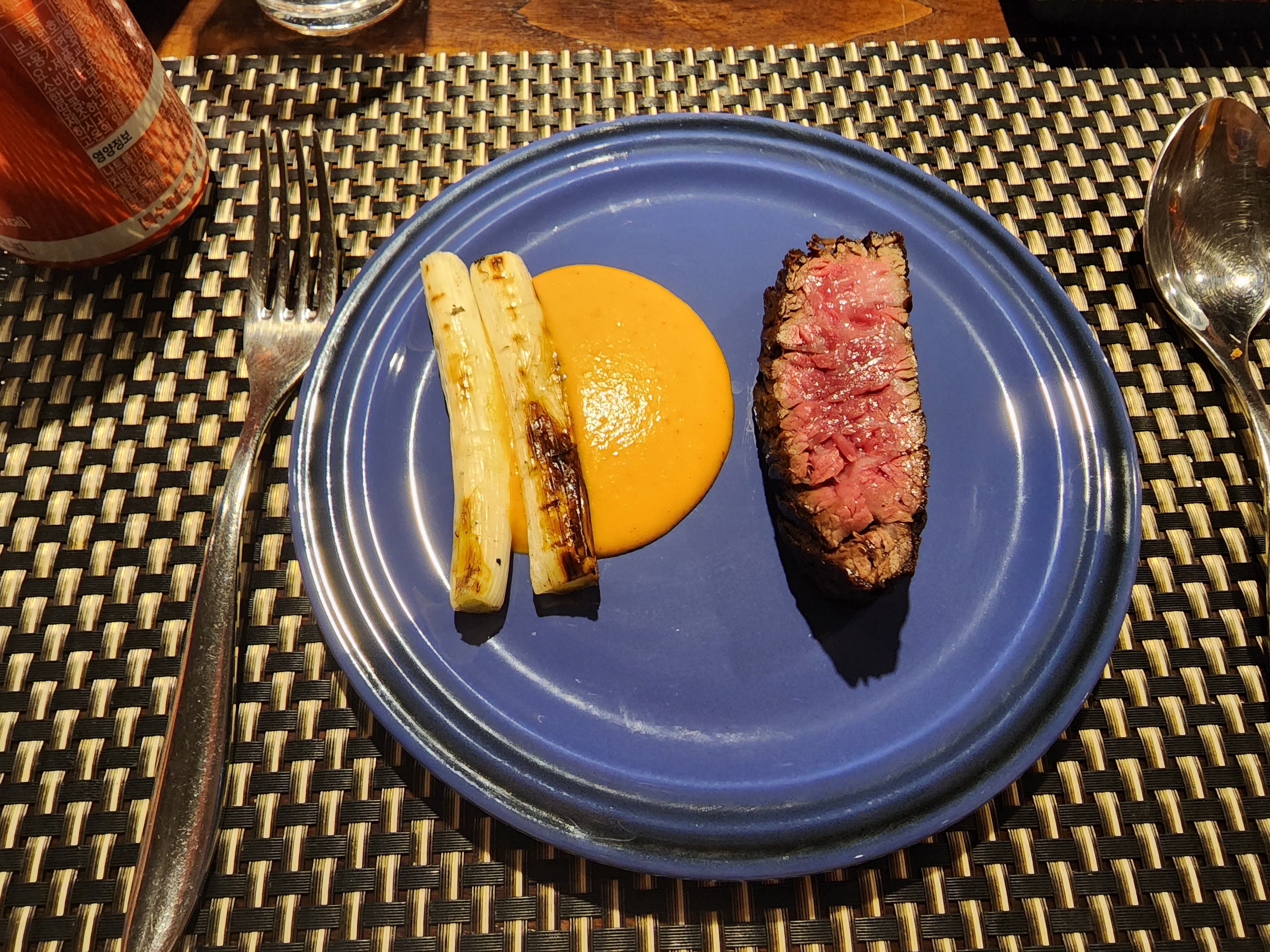 참숯으로 구운 와규 치마살과 대파구이 그리고 로메스코 소스가 한데 잘 어우러진 요리입니다.