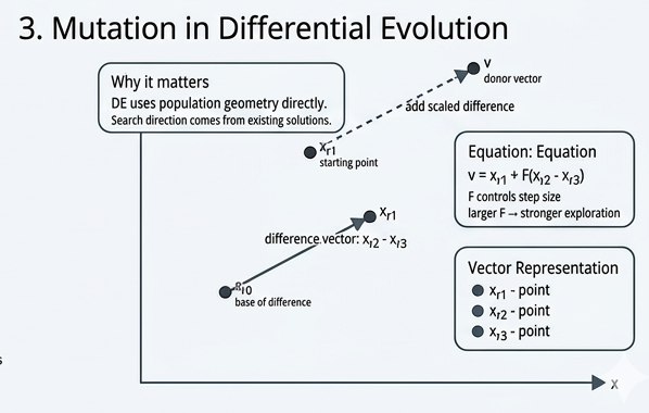 DE는 “개체군 내부의 차이 벡터를 이용해 새로운 후보를 만들고, 더 나은 해만 선택하며 전역 탐색을 수행하는 휴리스틱 최적화 알고리즘”이라고 이해하면 가장 쉽습니다.
