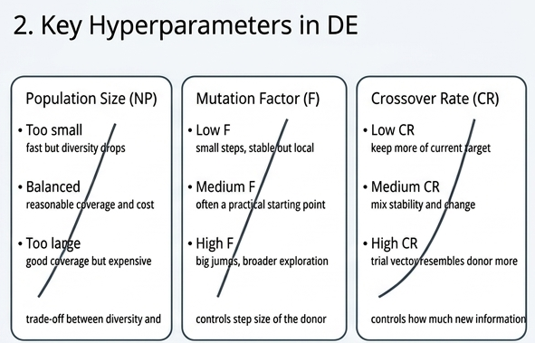 F, CR, population size, strategy 설정에 따라 탐색 성향이 꽤 달라집니다. 즉, “그냥 넣으면 무조건 잘 된다”기보다는 문제 성격에 맞는 설정이 중요합니다.