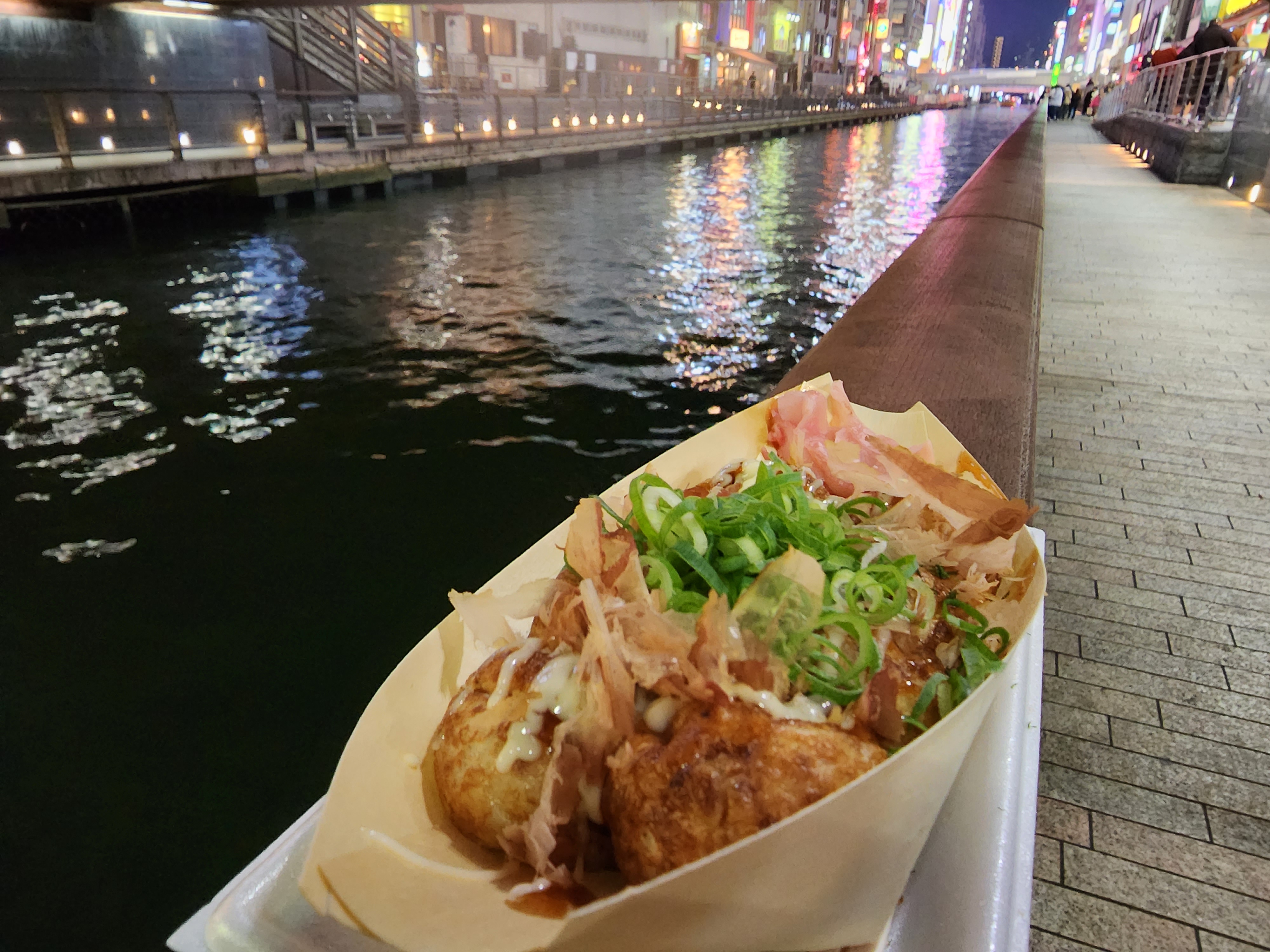 오사카 여행 첫 음식점인 만큼 도톤보리강을 바라보면 먹는 타코야키 맛있었습니다.