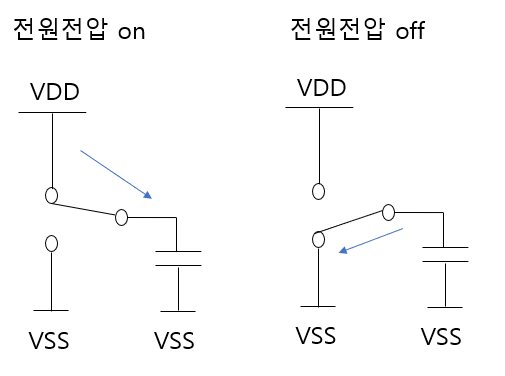 전원전압 Vdd와 연결되어 charging 되는 경우와 전원전압 Vdd가 off되어 Cap의 충전전압을 소모했을때 전류가 흐를 것입니다.
