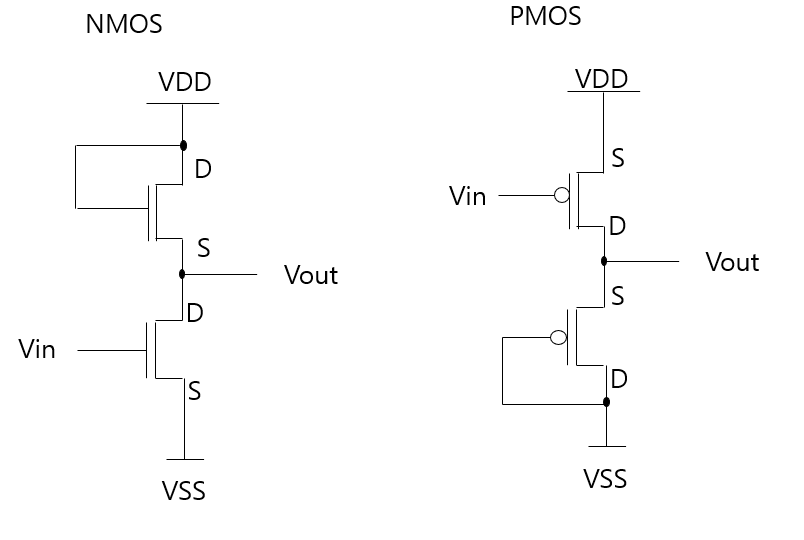 먼저 NMOS와 PMOS로만 회로 구성을 하는 이유는
