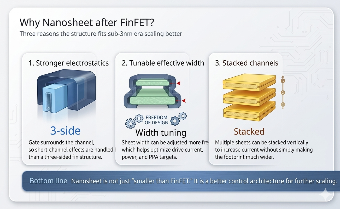 그래서 “왜 FinFET 다음이 나노시트인가?”라는 질문의 답은 비교적 분명합니다.