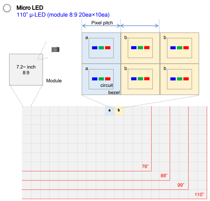 예시로 110인치 마이크로 LED를 만들기 위해선 아래와 같이 8:9 사이즈의 Module을 200개 붙이면 만들수 있고 고장난 Module만 교체하여 수리가능하고 크기를 붙였다 떼면서 자유자재로 조절할 수있는 장점이 있습니다.