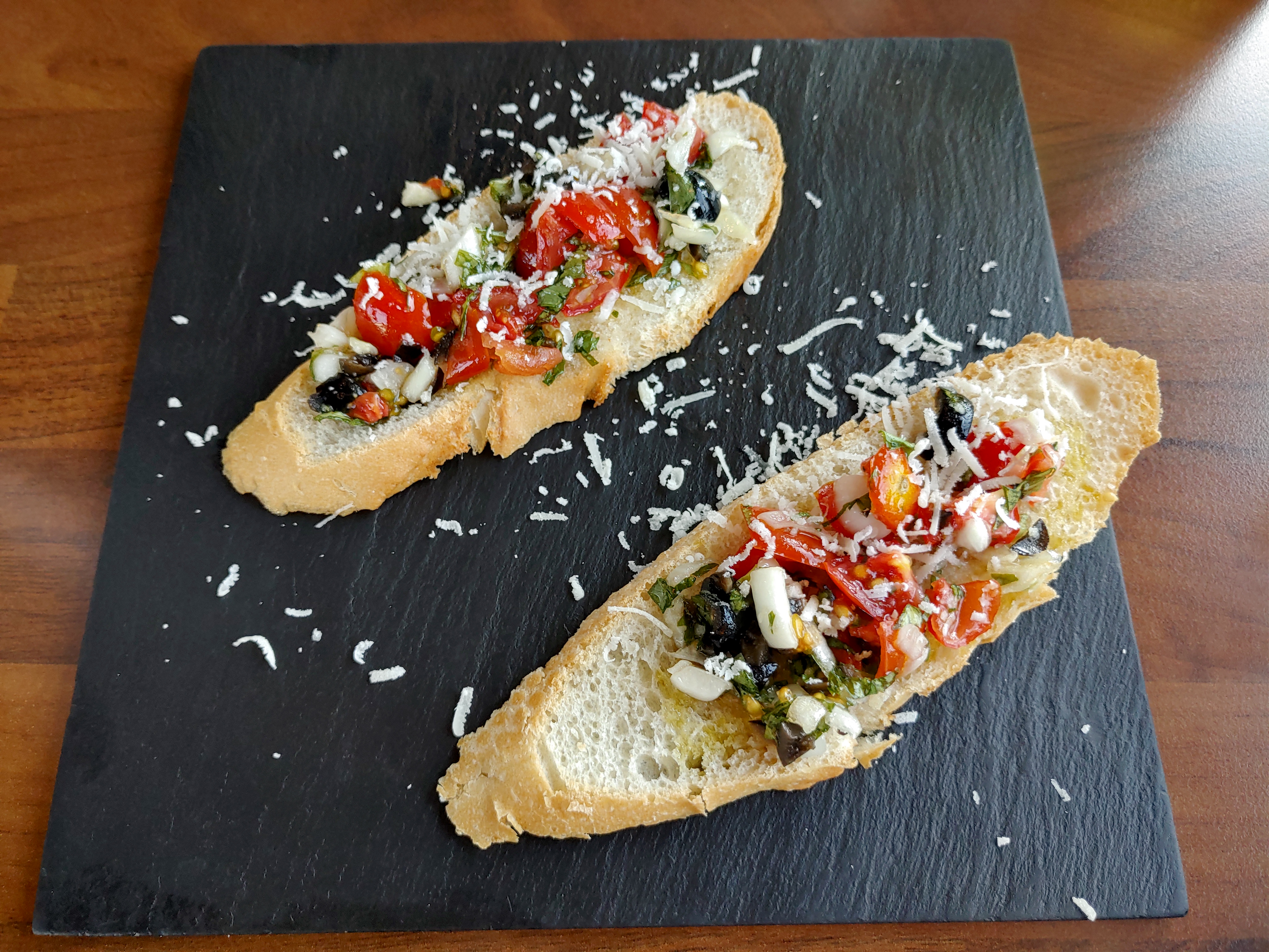 입맛을 돋아주는 발사믹 소스와 새콤한 채소, 빵 조합이 좋습니다.