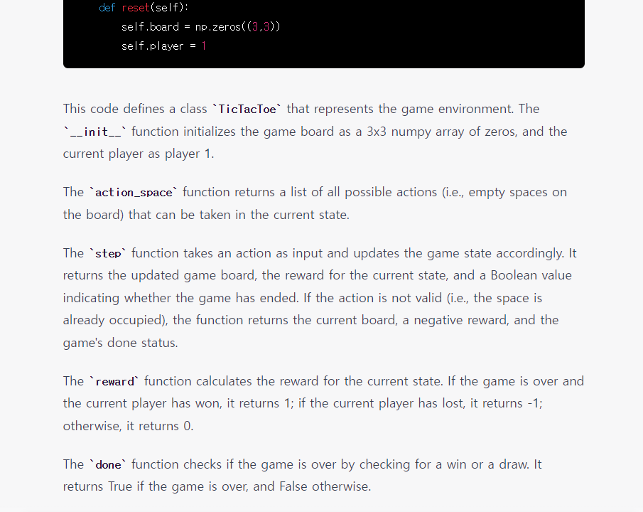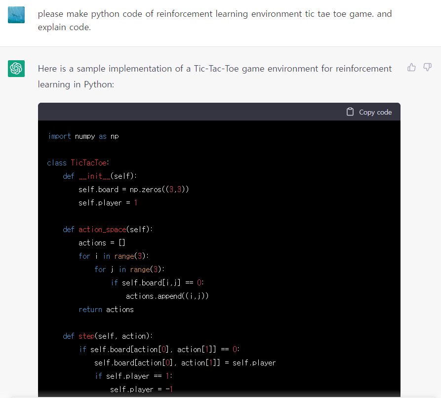 reinforcement learning 을 위한 게임 환경인 tic tac toe 를 코드로 짜달라고 요청해 봤습니다.